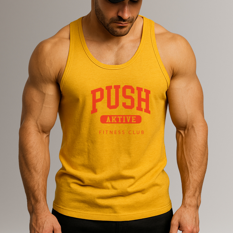 Yellow tank top with 'PUSH AKTIVE FITNESS CLUB' text worn by a person on a gray background